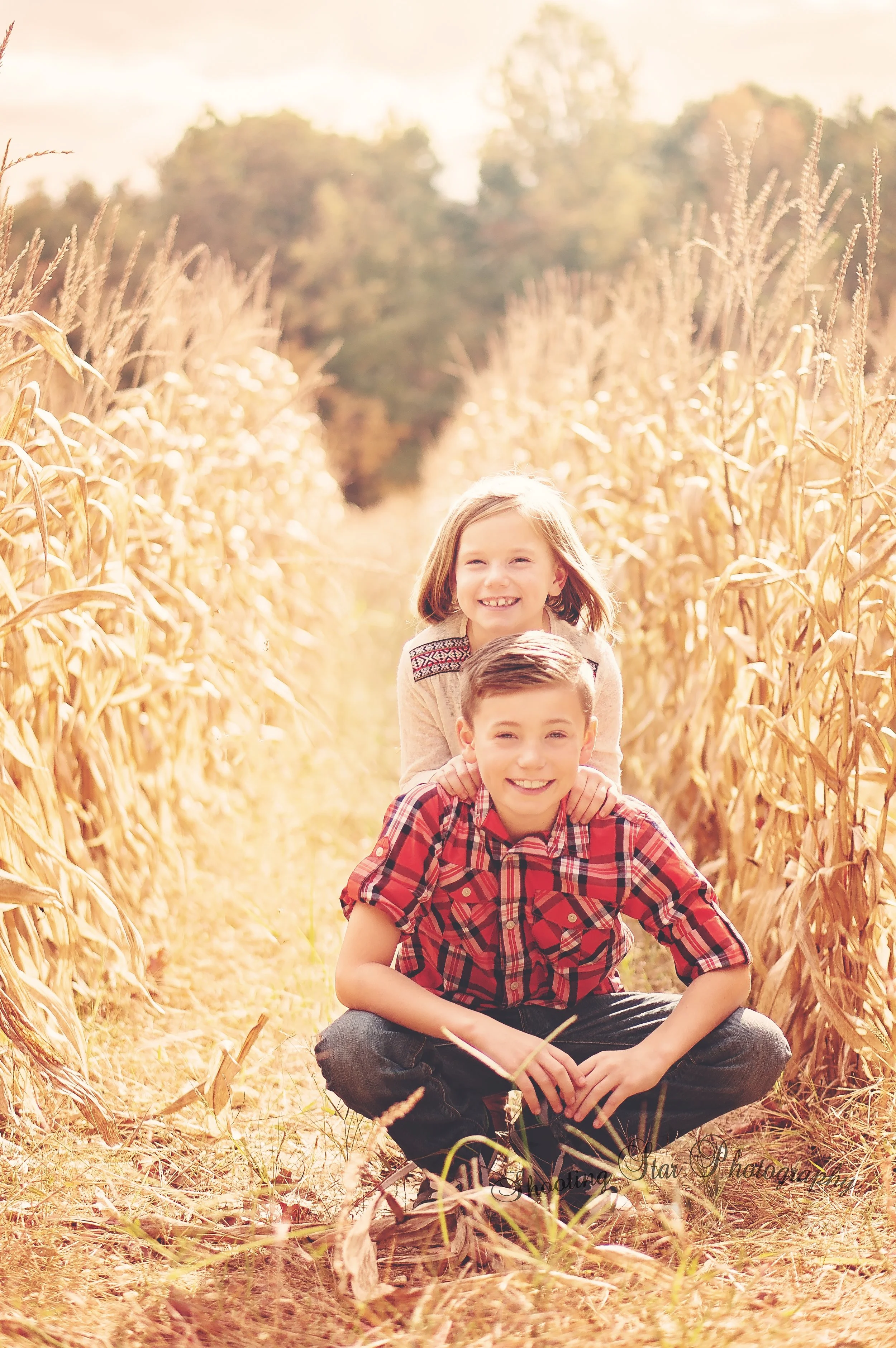 This particular site has wonderful leading lines, great shade coverage for mid-afternoon shooting.. Cornfields, rustic fences, a meadow and a stream! If you were to add a barn, this would be the ultimate location. I picked this particular location because it was autumn and the beautiful colors on the trees were starting to show. Mom wanted fall pictures and that's what I wanted to deliver!